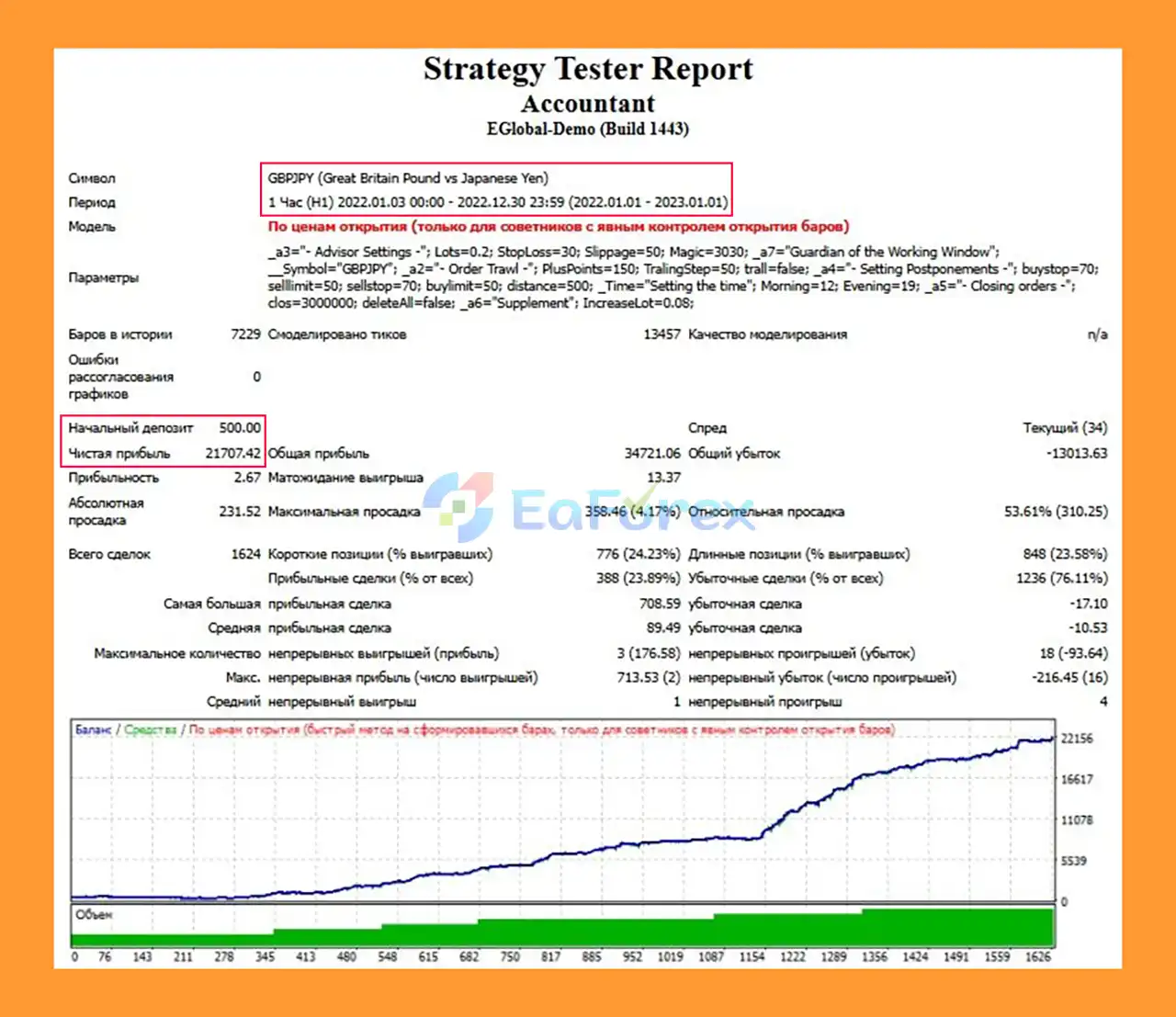 Example: Initial $500 → $21,707 net profit with maximum drawdown 4.71% (12 months GBPJPY).