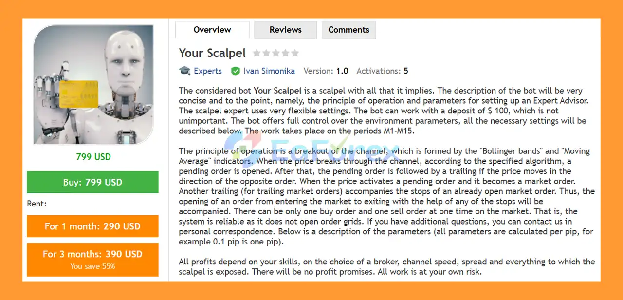In summary, Your Scalpel EA MT4 is a precision-focused scalping Expert Advisor for the MetaTrader 4 platform, designed to capture short-term breakout opportunities using a channel-based strategy built from Bollinger Bands and Moving Average indicators. By combining pending order execution, dual trailing mechanisms, and spread filtering, the EA aims to deliver accurate trade entries while maintaining disciplined risk control. With flexible configuration options, automatic money management, and a no-grid, no-martingale trading structure, Your Scalpel EA MT4 provides a reliable and customizable automated Forex scalping solution for traders seeking precise and controlled short-term trading performance.