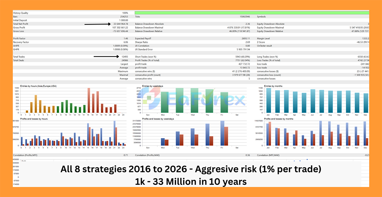 The EA uses a combination of 8 independent breakout strategies that run in parallel. Each strategy evaluates market conditions and triggers trades only when breakout confirmations meet predefined criteria.