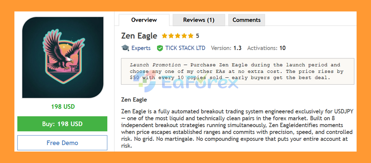 In summary, Zen Eagle EA MT5 is a specialized and fully automated breakout trading system designed for USDJPY, combining a multi-strategy framework with strict risk management and independent trade execution. By avoiding high-risk techniques like grid and martingale, it focuses on stable performance, controlled exposure, and consistent breakout detection across different market sessions. With its 8 parallel breakout strategies, high adaptability, and strong performance results from both live signals and backtesting, Zen Eagle EA MT5 offers a disciplined and efficient solution for traders seeking reliable automation, scalability, and long-term trading consistency in the MetaTrader 5 environment.