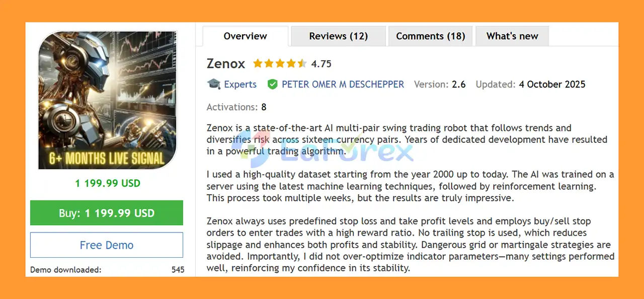 Zenox EA MT5 combines AI-driven trading, reinforcement learning, multi-pair risk diversification, verified live results, and flexible management from a single chart. Regular updates and dedicated support ensure consistent performance under changing market conditions, making it a reliable solution for modern forex traders.